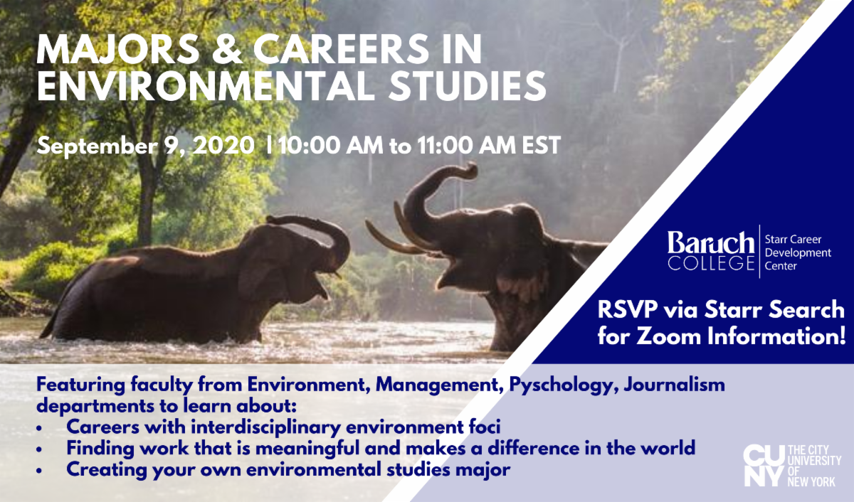 Distinguished Baruch college professors will discuss careers with an environmental/sustainability focus. Learn how to create your own major (ad hoc major) with an environmental focus by combining disciplines such as environmental studies, psychology, journalism and management.