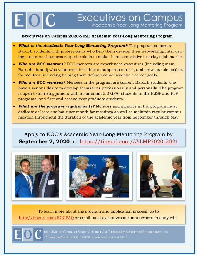 EOC’s Academic Year-Long Mentoring Program is a professional partnership* between Baruch students and their EOC Mentors. The Program is a commitment: the Mentor and Mentee must meet virtually at least once per month and maintain regular contact via email or telephone. The program helps students define and achieve their career goals by providing executive Mentors (some are Baruch alumni) who volunteer their time to support, counsel, and serve as role models for Mentees. Mentees in the program are current Baruch students who have a serious desire to develop themselves professionally and personally.