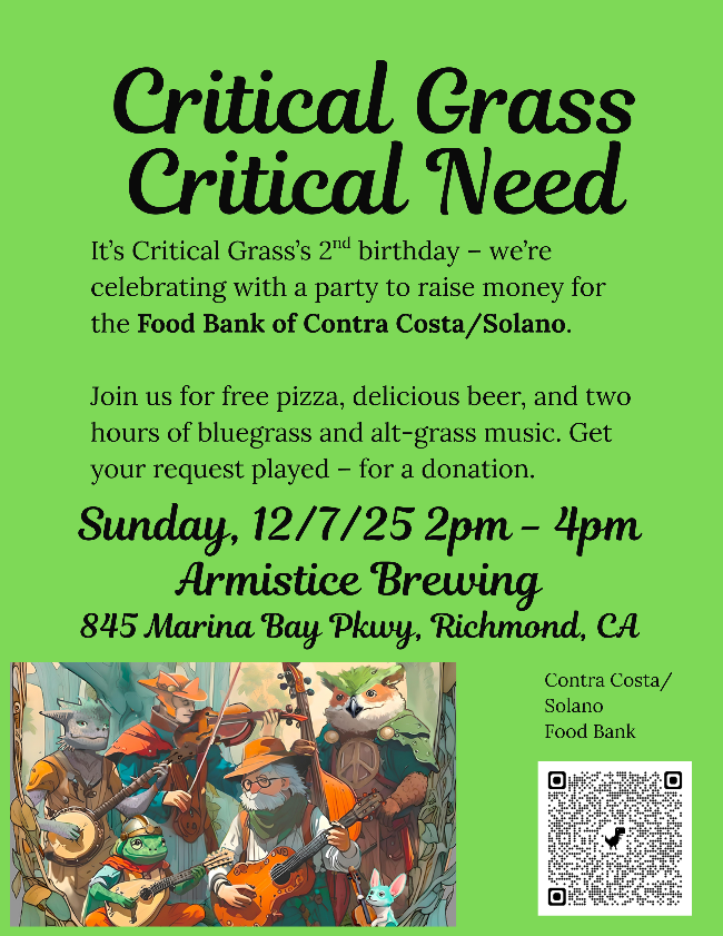 - Dec. 10: Welcome Grange, Napa; dabaron7-at-comcast-dot-net; NOTE: mandolin workshop with Don at 3 pm (add’l charge, same contact)