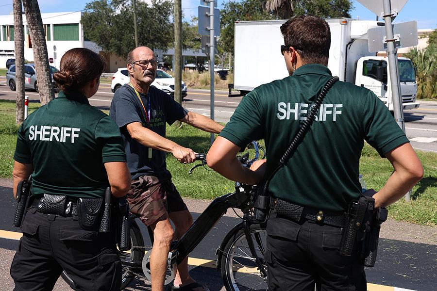 The Community Policing Deputies help educate people on the Trail and elsewhere about e-bike safety and laws. They also take the time to chat with people about their concerns. On their recent patrol, they heard tips regarding particular intersections that people were concerned about. With the entire Pinellas Trail Loop being 75 miles long, it is impossible for law enforcement to constantly patrol all of it, so they rely on citizens to help them find the problem spots and the rule-breakers. Deputies Pappamihiel and Brooks handed out business cards and encouraged people to report any issues. They monitor the ebb and flow of trail activity and look for changing patterns, then set up patrols of the area at the time they anticipate problems.