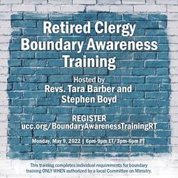 Maintaining healthy boundaries is challenging at any stage in ministry and it is particularly tender and difficult attending to boundaries as we transition out of our last call, and while in retirement. Using "A Sure Foundation", "The Ministerial Code" and Rev. Dr. Bruce Epperly's new book, "The Jubilee Years," Rev. Stephen Boyd and Rev. Tara Barber will offer a focused Boundary Awareness Training for those entering and living in retirement. Note - This training completes individual requirements for boundary training ONLY WHEN authorized by a local Committee on Ministry.