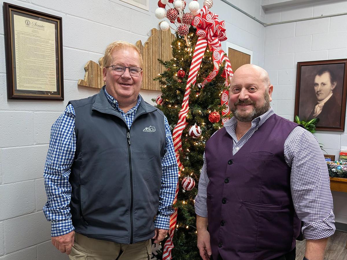 Kentucky Sheriffs' Association Executive Director Jerry Wagner, left, and Harrison County Sheriff Shain Stephens lead an association meeting held at KACo. | |