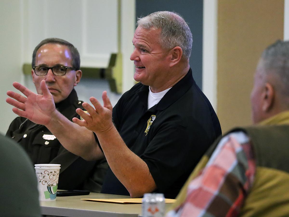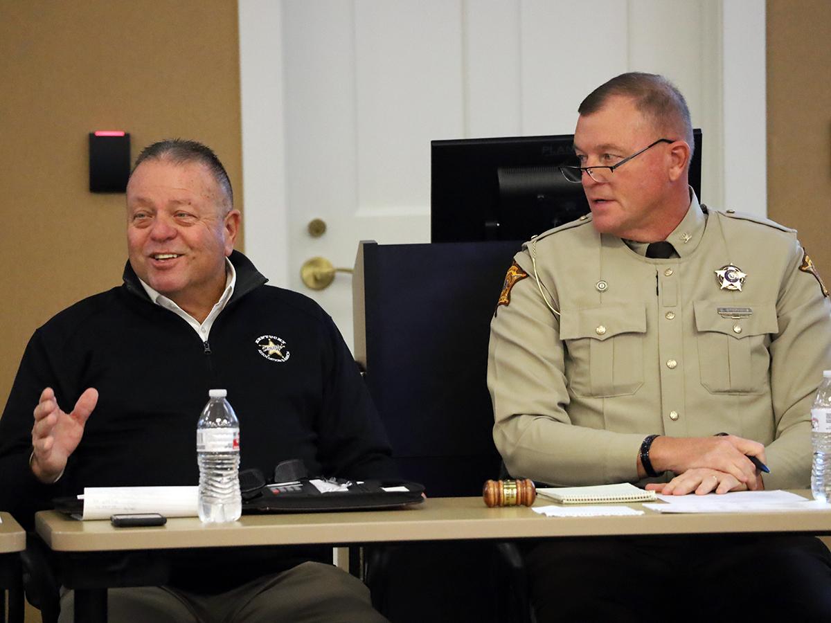 Hardin County Sheriff John Ward, left, listens to Jefferson County Deputy Sheriff Bill Burch during a discussion at the sheriffs meeting. | |