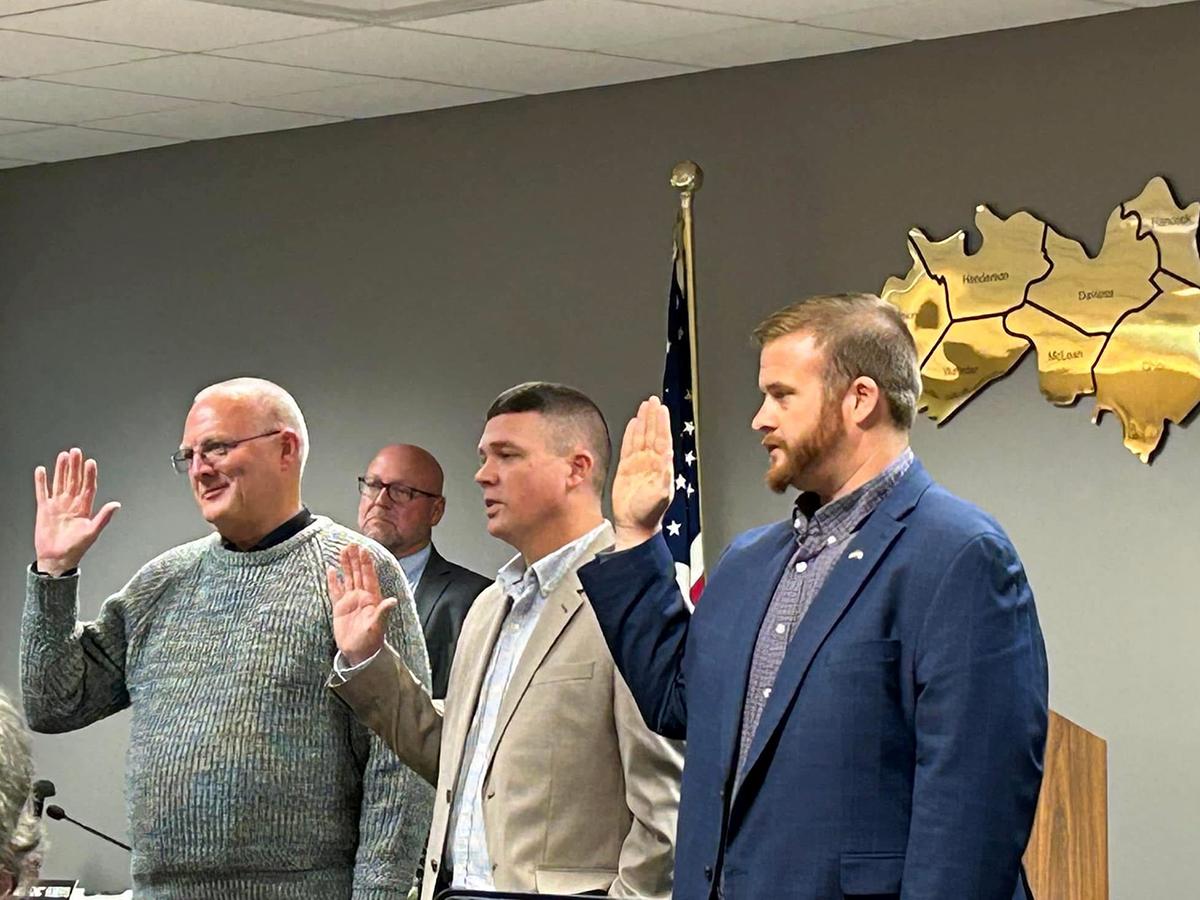 From left in front, judge/executives Charlie Castlen (Daviess County), Johnny Roberts Jr. (Hancock County) and Curtis Dame (McLean County) are sworn in as GRADD officers. Roberts will serve as chairman, Dame secretary and Castlen treasurer. | |