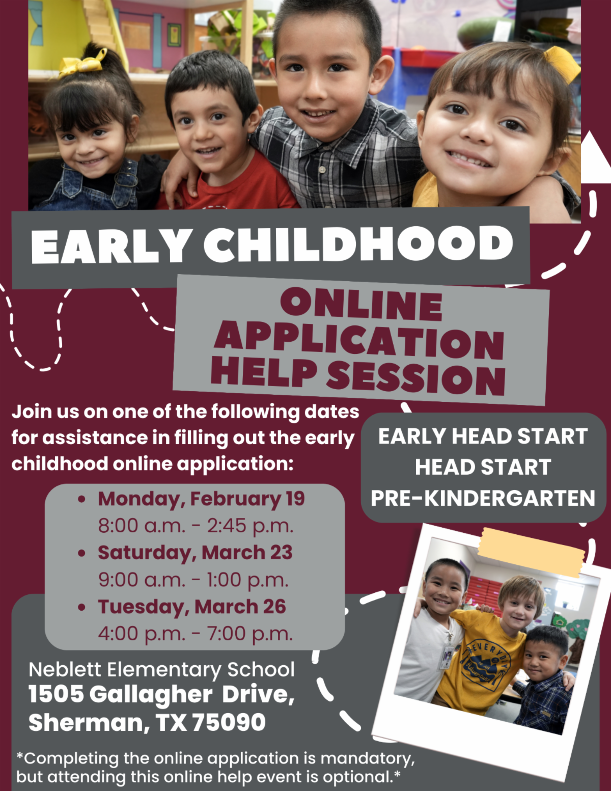Early childhood applications are now being accepted for the 2024-25 school year! Please see the criteria for Pre-K, Head Start and Early Head Start to see if you qualify, and plan to attend an upcoming help session at Neblett Elementary if you need assistance filling out the online application form. The next session is this Saturday!