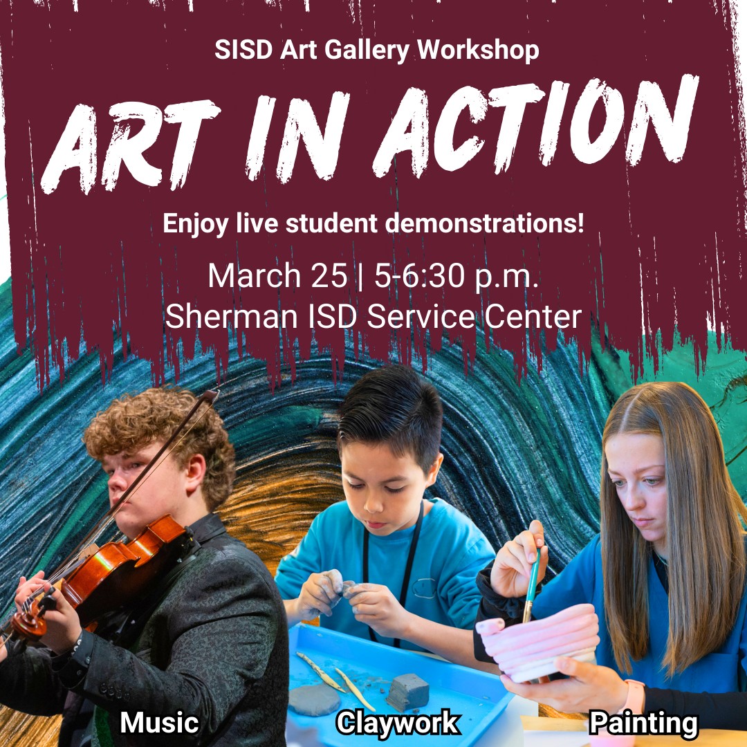 Did you know March is Youth Art Month in Texas? Join Sherman ISD art educators and their students at the SISD Service Center on Monday, March 25 for the first ever “Art In Action” event! This art gallery workshop will feature live demonstrations of music, claywork, painting and more done by Sherman students and teachers! The workshop begins at 5 p.m. and closes at 6:30 p.m. | |
