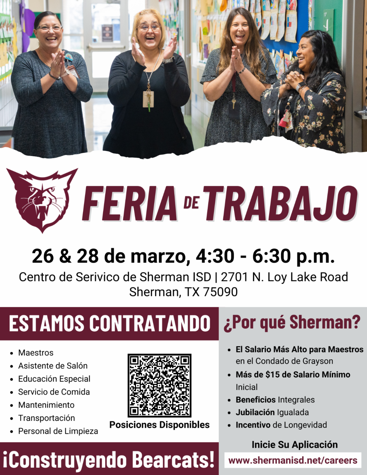Join us next week on March 26 or 28 from 4:30-6:30 p.m. at the Sherman ISD Service Center, 2701 Loy Lake Road, to meet with staff and learn about career opportunities.