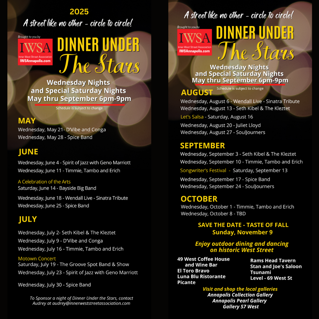 Inner West Street Association is the proud sponsor of Maryland's premier art festival. From May through November, thousands of visitors enjoy shopping along beautiful West Street in downtown historic Annapolis.