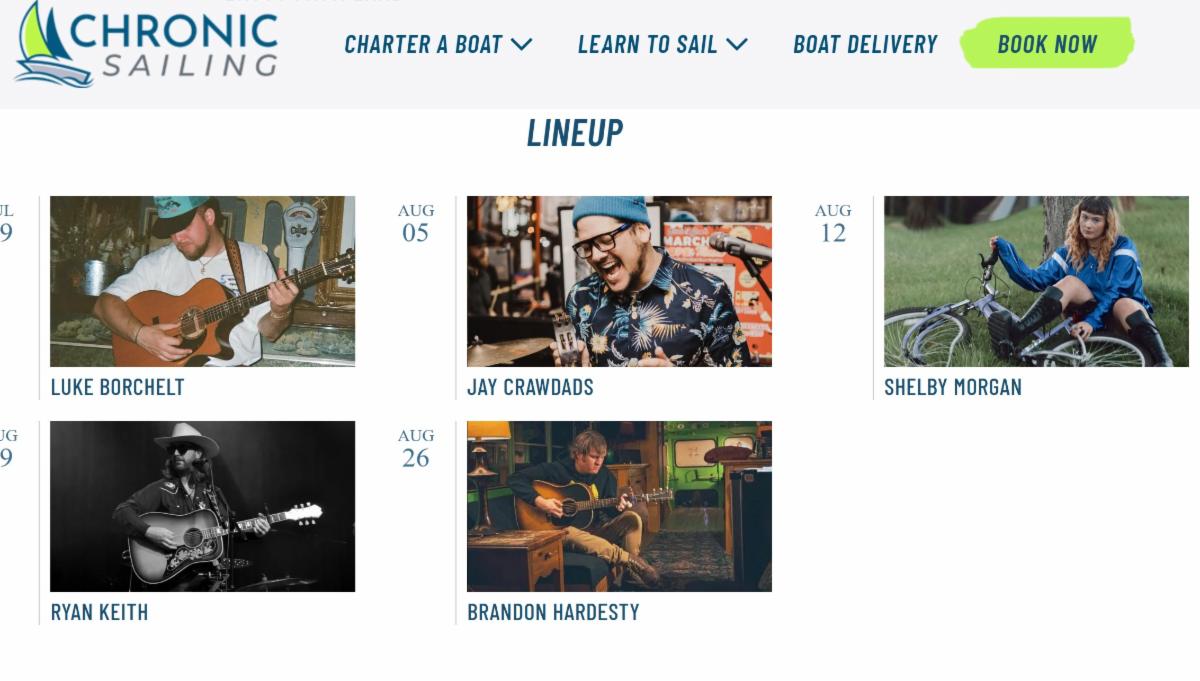 Enjoy live performances from local musicians aboard a floating stage: an anchored 40’+ foot catamaran sailboat provided by Chronic Sailing.