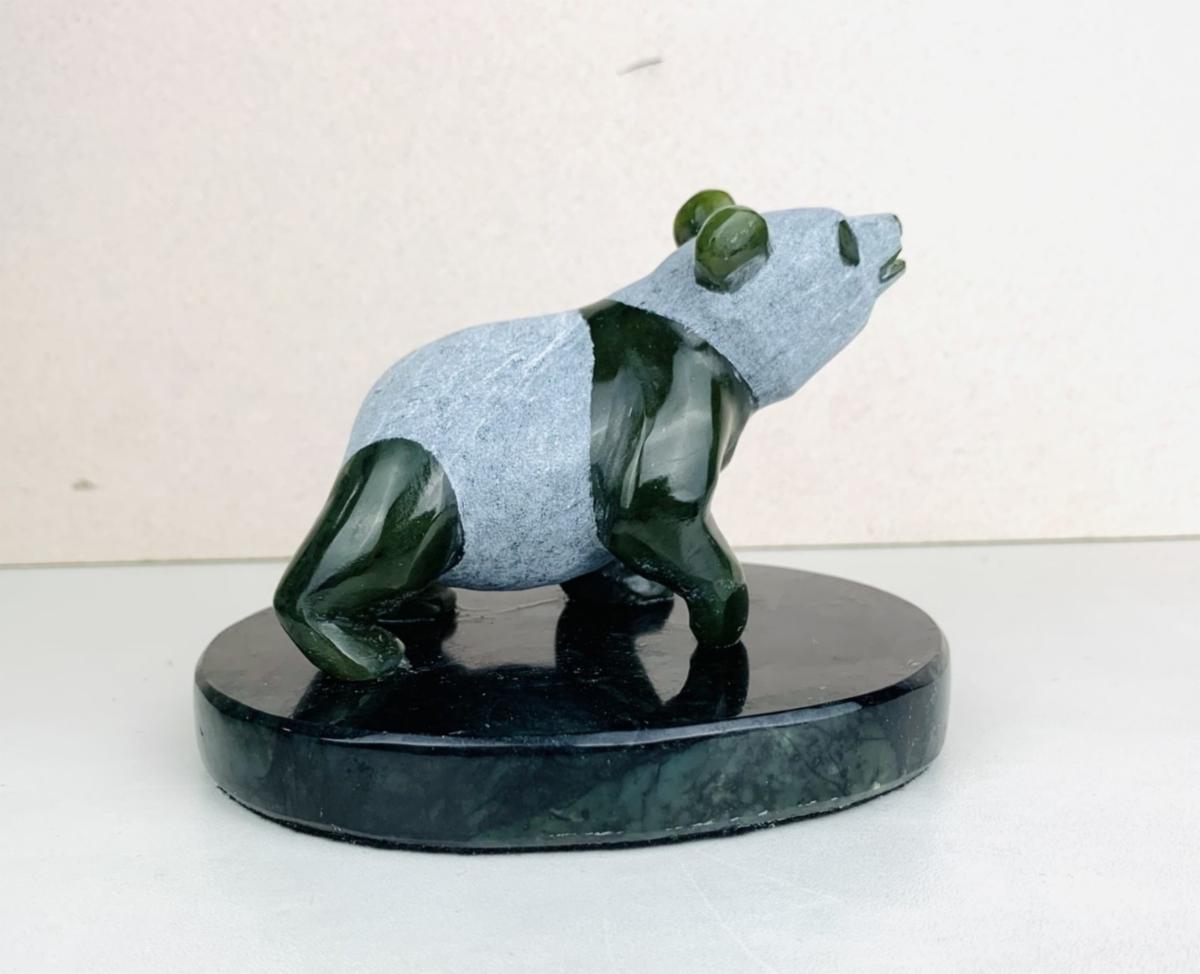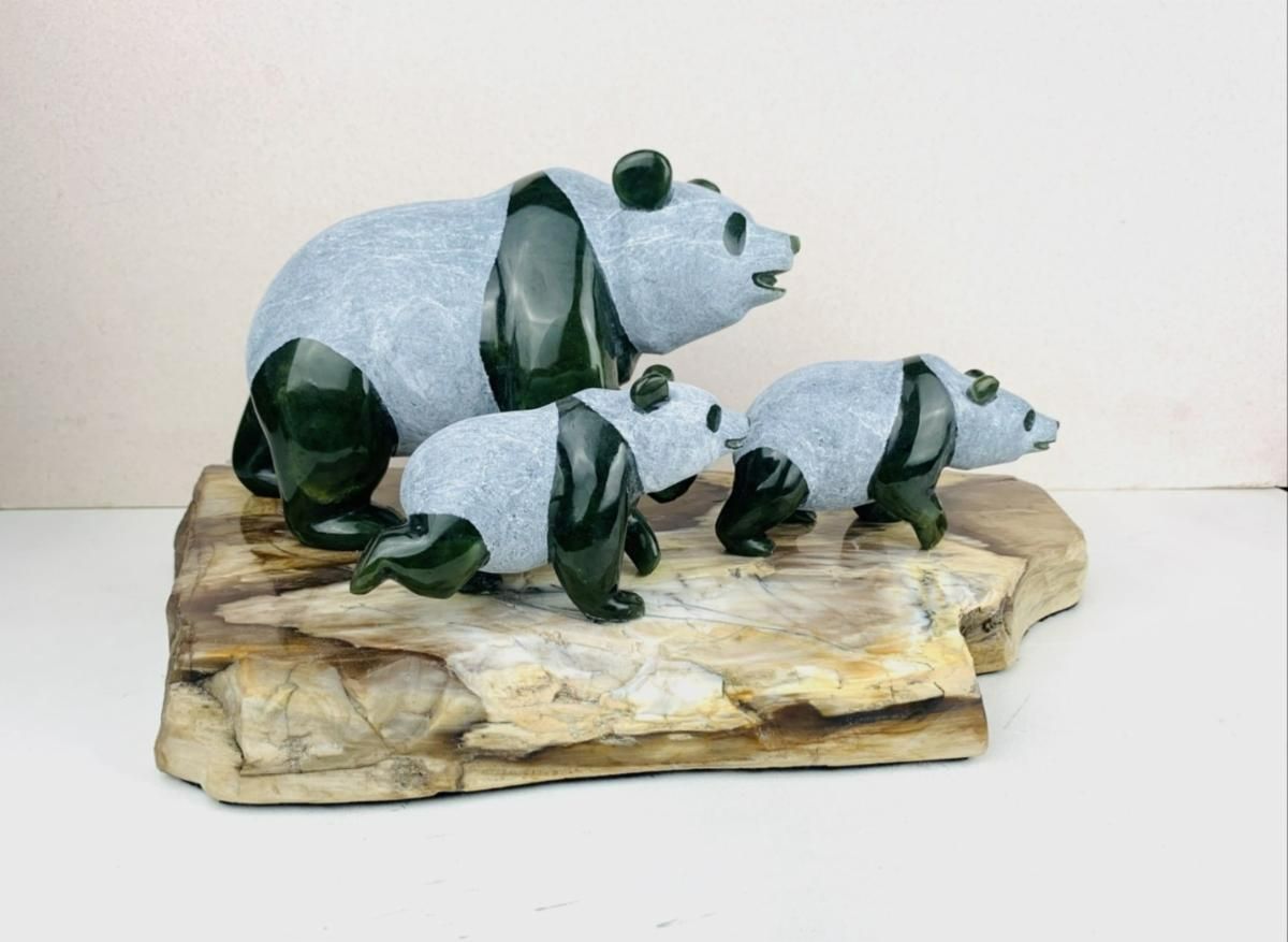 Charles began his artistic career under the mentorship of David Wong (1937–1998), one of Canada’s most respected jade carvers. Over the years, Charles has become known for his striking wildlife sculptures: eagles, bears, owls, and salmon. His latest collection introduces a charming new subject, the panda bear, captured in a series of joyful and expressive poses. Charles’ work also incorporates diverse materials, including mammoth ivory and rhodonite, resulting in compositions that demonstrate both technical sophistication and intricate craftsmanship.