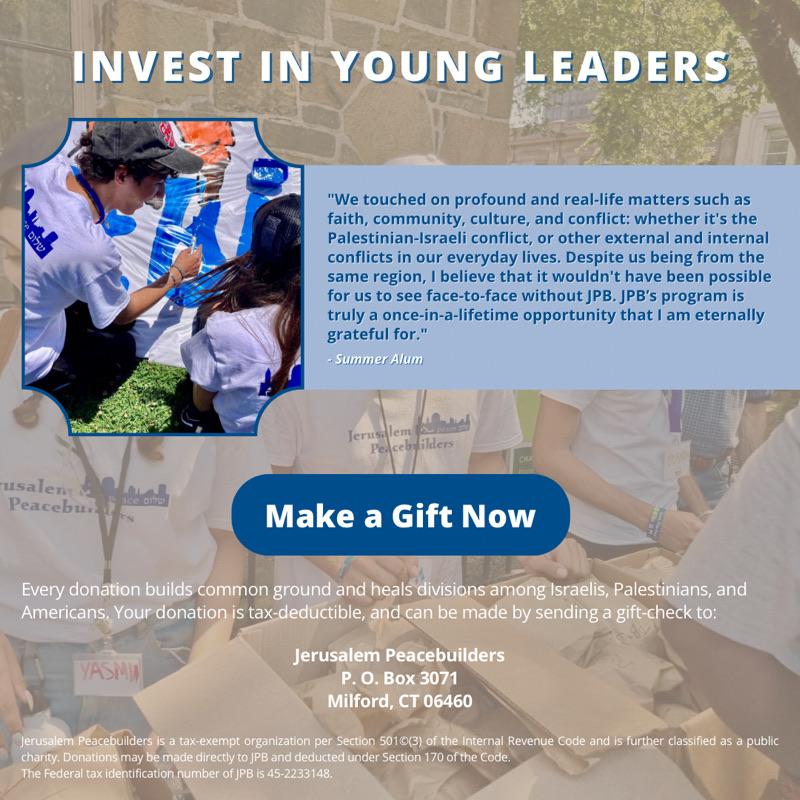 Please hold JPB's courageous teens, adult participants, and staff tightly in your hearts. They are risking everything to heal divides and build a new future for the Holy Lands.