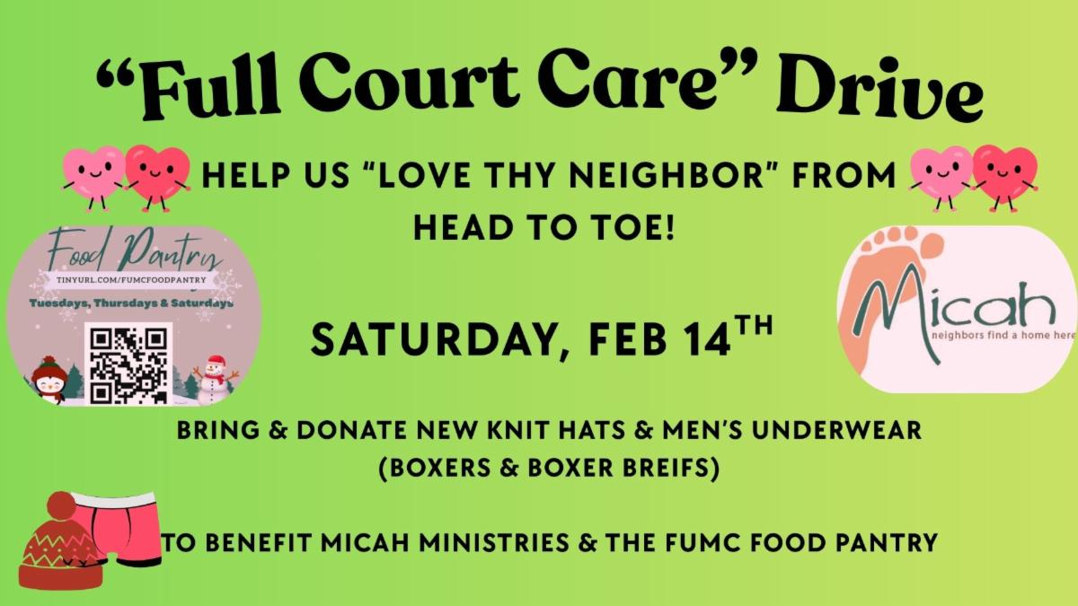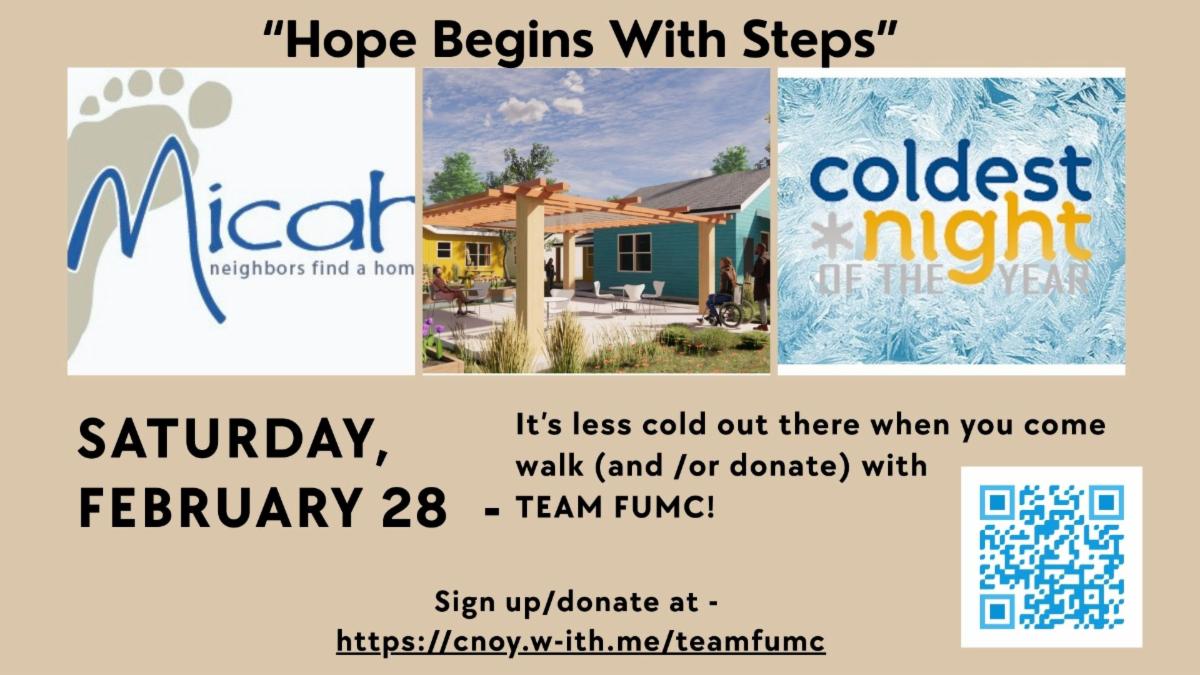 | | | This weekend, help us collect knit hats & men's undewear (boxers or boxer briefs) for our special collection via UPWARD basketball, however anyone can help! Bring hats or underwear by any time Saturday, Sunday or all of next week and look for the bin in the Gathering Space (or Mission Control, during the week!) | | | TEAM FUMC is currently #3 in the NATION!! Help us gain more momentum as we head towards The Coldest Night of the Year! Click on the graphic below to sign up and/or donate!! | |