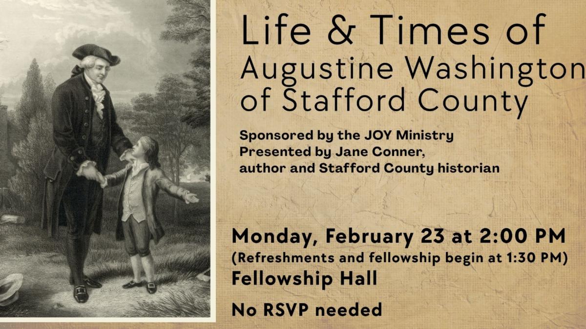 Life & Times of Augustine Washington in Stafford County! JOY Ministry sponorsed February speaker on Monday, February 23rd! Don't miss this presentation by Jane Connor; she was at Ferry Farm (last May JOY program) describing her saving of Stafford County’s Government Island Historical Site, and her campaign to save Ferry Farm Historic site from Walmart building on it! Come to the Fellowship Hall at 1:30 PM for fellowship & light refreshments!