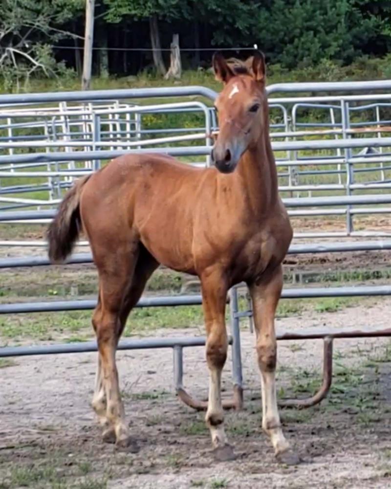 We've partnered with Liz Caron from Carbery Fields Farm for our dressage horses. She competes our stallion Schroeder (Sandro Hit x Escudo I) at FEI Grand Prix. Although he is Hanoverian bred and approved, he has passed all the KWPN criteria and now produces KWPN foalbook (VB) foals. We've been thrilled with his amazing character and trainability and are excited that he is passing it on to his offspring. It’s exciting now that his first offspring are starting in the FEI levels too and doing well.