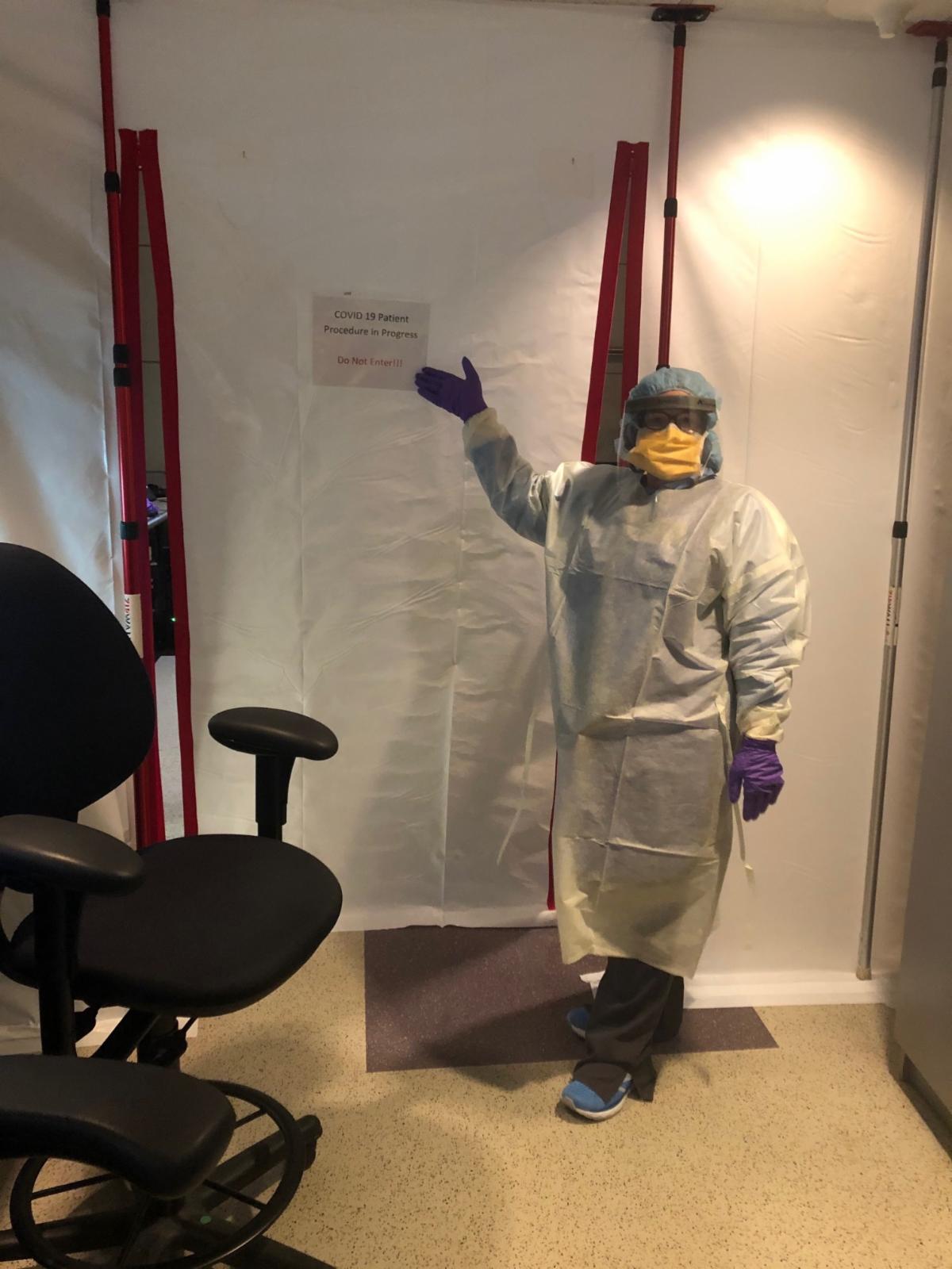 before her first COVID-19 patient in CSIR. We erected a barrier to ensure staff would not come through when we were coming in and out of the rooms for scanning.