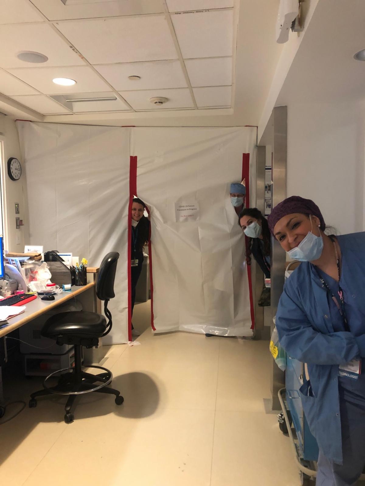 came up with the idea of a barrier for the control rooms after performing a procedure on their first COVID patient, which allows physicians and staff to come out of the rooms without donning and doffing PPE every time. They met with Infection Control and Brian Atkinson to put up the first barrier in the CT area in Shapiro. They received such great feedback that barriers were immediately put up in Angio and CSIR. Cath lab and EP leadership loved the idea and the next day, they had their barriers up. Great teamwork between, physicians, nursing, technologist, IC, engineering and leadership!