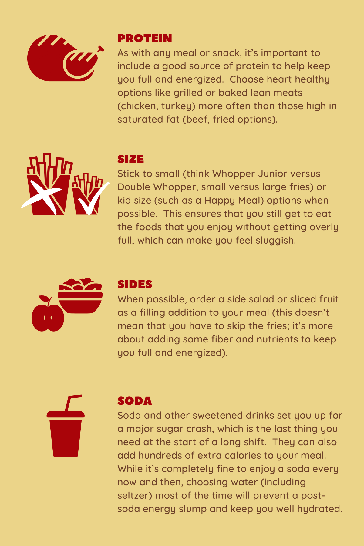 "With time at a premium, you may find yourself relying more than usual on fast food. If dinner is coming from the drive-thru more often these days, keep the below in mind to ensure a balanced and filling meal. As always, thank you for all that you do."