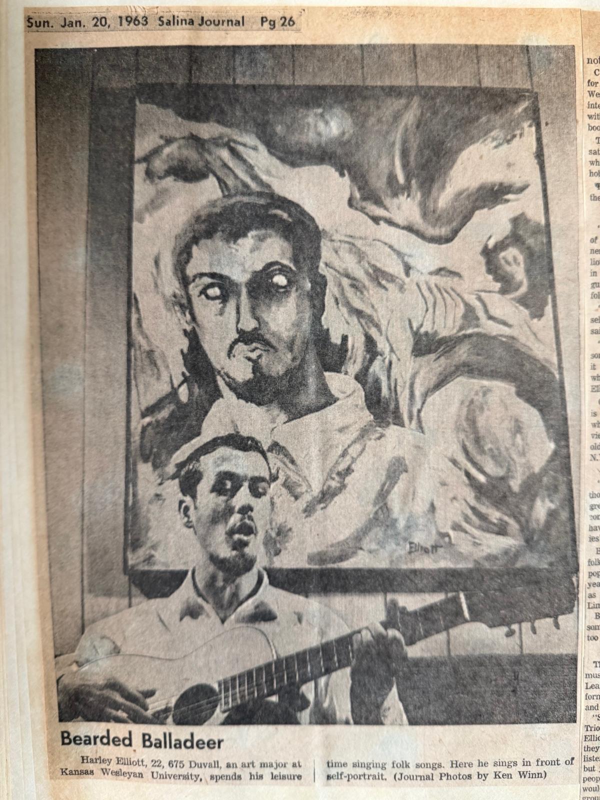 My answer for the last four decades as a member of the arts community is the same—If you see a void, then be a part of the solution and help fix it. You don’t have to do it alone, but for meaningful things to happen, it takes a champion. One such champion for many years has been Harley Elliott. A newspaper article in the scrapbook was an interview with Kansas Wesleyan University senior Harley Elliott. At the time he was a visual arts major, a writer, and enjoyed singing folk songs around the community.