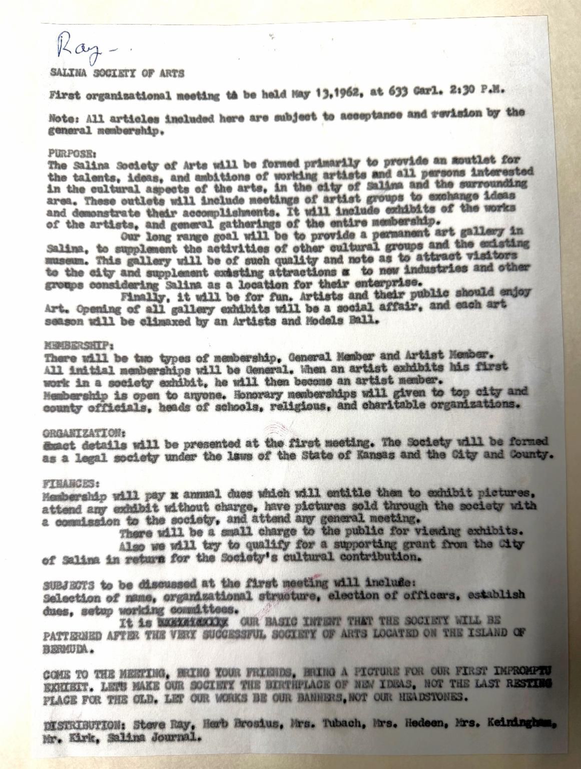 The attached document photo is the founding paper for the Salina Society of Arts. The group was formed by a small group of artists and art lovers who felt Salina needed stronger connections between art, artists, and the public.
