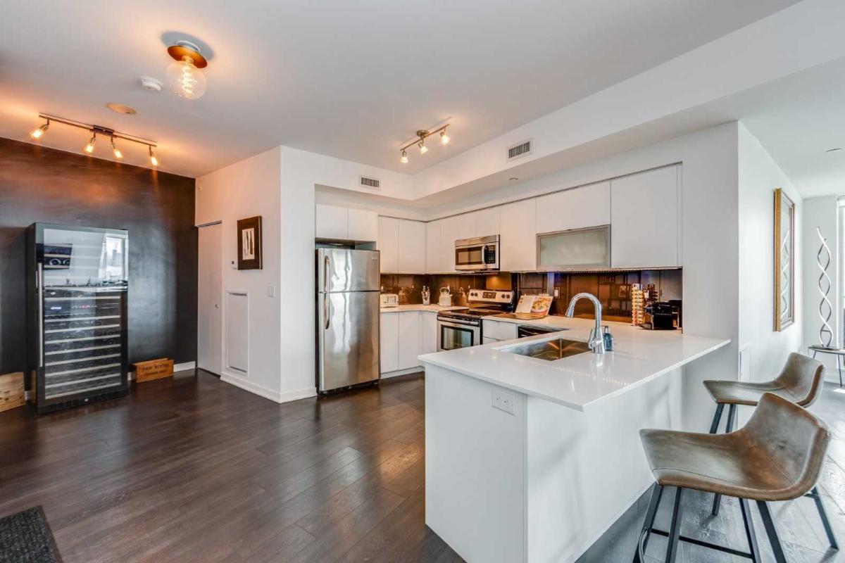 Super-stylish, King West, one bedroom plus den suite with balcony, well maintained with newly renovated bathroom and a ton of storage, parking and locker included. Huge primary bedroom with double closet and laundry combined, wood floors throughout, large den/office also used as separate dining room. Pet friendly and steps to parks, Trinity Bellwoods, Ossington, the lake, trails, financial core and more with transit at your door.