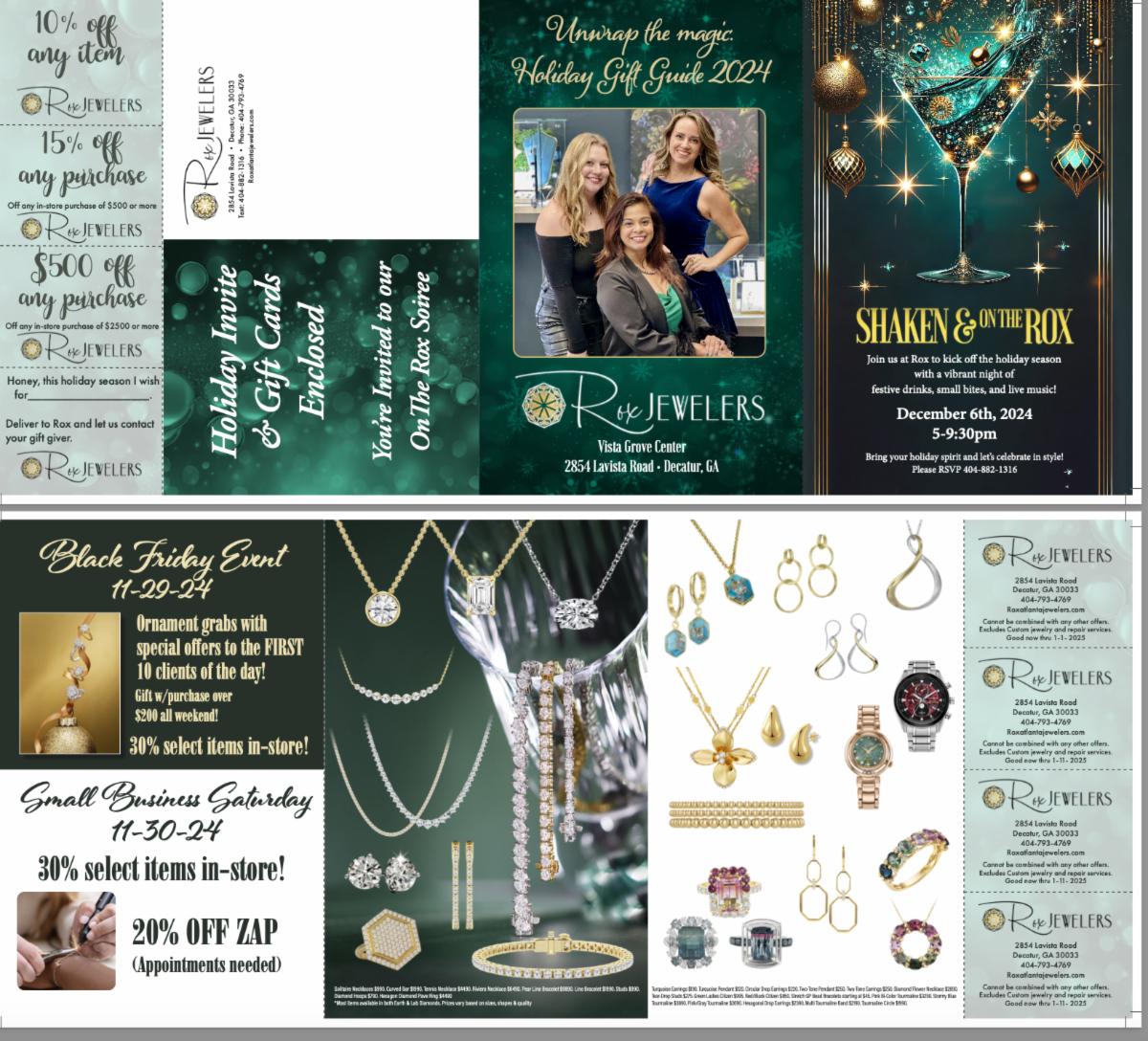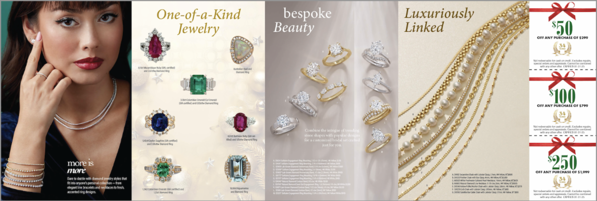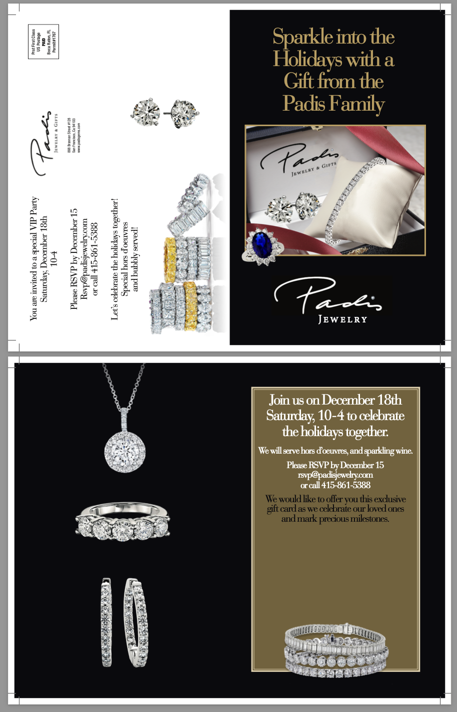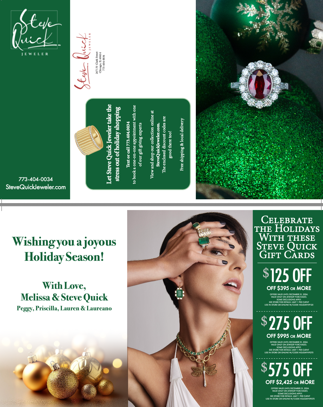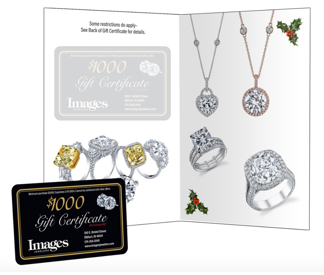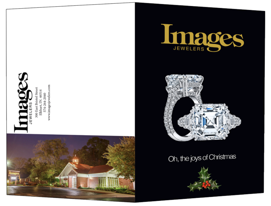 Below: Folded Holiday cards with either a printed gift card on the inside right panel (can be perforated for easy removal) or a separate gift card attached by a glue dot that can be removed and placed in yourcustomer's wallet. Size: Folds to 5.5" x 8.5"