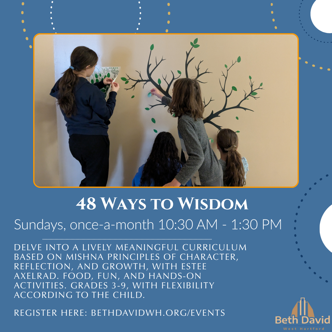 The next part of our journey called 48 Ways to Wisdom will be on Sunday, February 15 from 10:30 AM to 1:30 PM. Please REGISTER for the next session thru the Beth David website or click the link below.