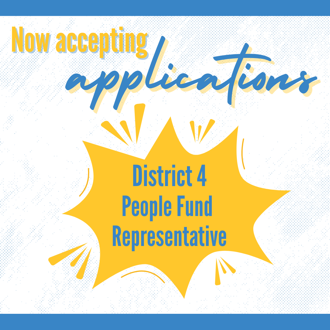 - The District 4 representative would be responsible for presenting any grants within their district to the People Fund board at large, voting on all grants put before the board, and being present at all meetings.