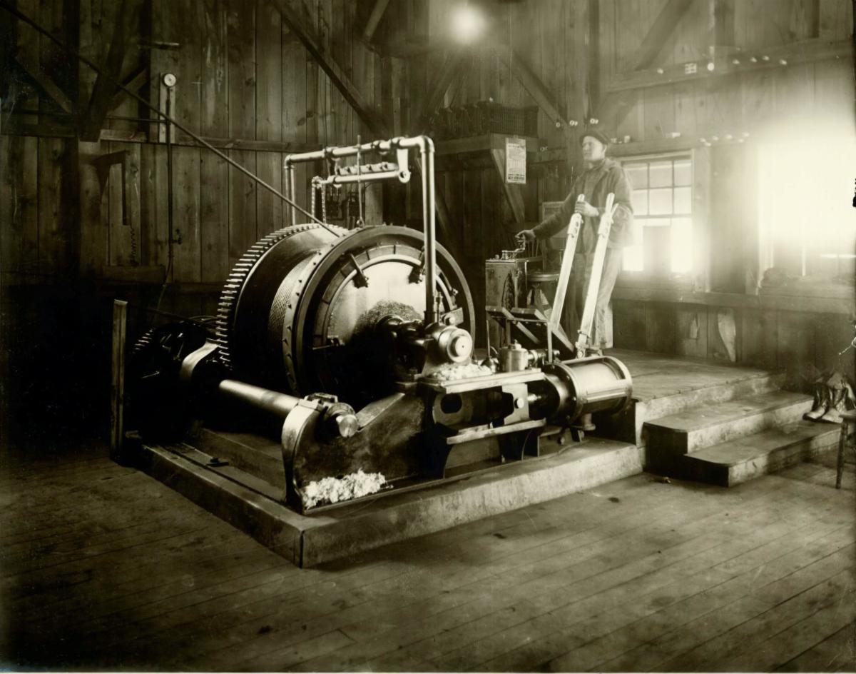 A hoist is used to transport people and ore in a mine. The winch is used to lower and raise the cages in the hoist.