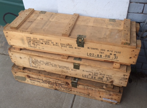 We got a nice stash of these crates- they are all 1960's and 1970's production and in great shape. They measure 37"x12"7.5" on the outside, with a hinged lid with clasp and 2 heavy duty rope handles. They are heavy duty crates made to hold 100+ pounds being moved around on the battlefield while keeping the high explosive contents safe, so they are well built and heavy duty (and heavy, averaging 20 pounds each!) made of heat treated, non-pressure treated wood (so no chemicals in it). Tons of great uses for them- check out the one great idea below!