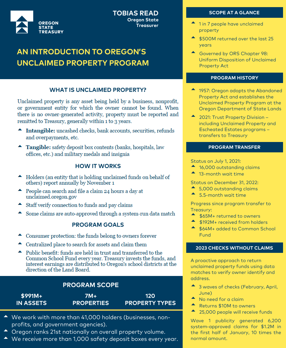 Oregon's Unclaimed Property Program has been helping Oregonians access their unclaimed funds for more than 60 years. The Dept. of Treasury began managing the program in 2021, with the goal of connecting more Oregonians with money the state is protecting on their behalf. Over the last 25 years, the Unclaimed Property Program has returned more than $500 million back to individuals. Nearly 1 in 7 people have unclaimed property.