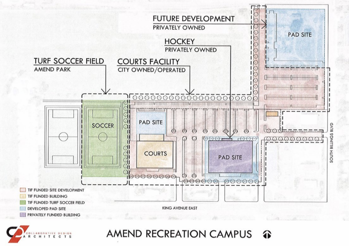 The current draft plan for the Amend Recreation Campus (ARC) is to use TIF money to provide infrastructure, parking, sports courts that could be managed by the city, and another turf field for soccer/lacrosse that could be managed by the Amend Park Development Council. Additionally, a few pad sites will be prepped for development, including one that could be used for construction of a two-sheet ice facility.