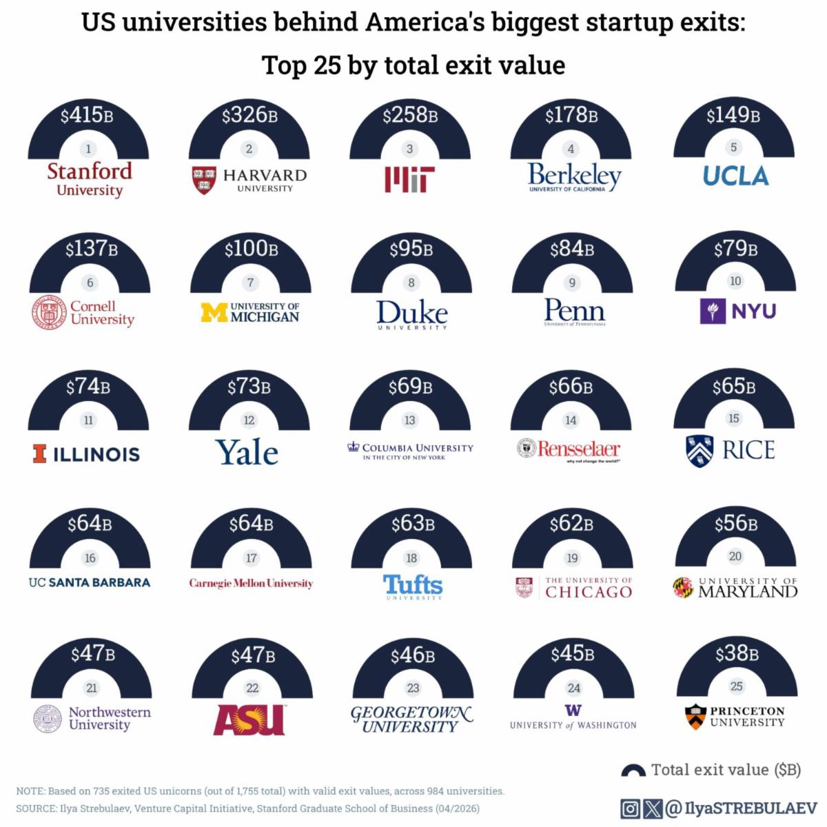 At the top of the list are Stanford University at $415 billion, Harvard University at $326 billion, and MIT at $258 billion. The rankings reflect the combined exit value of companies founded by alumni from each institution, based on exited U.S. unicorns with valid exit values across a large multi-decade dataset.