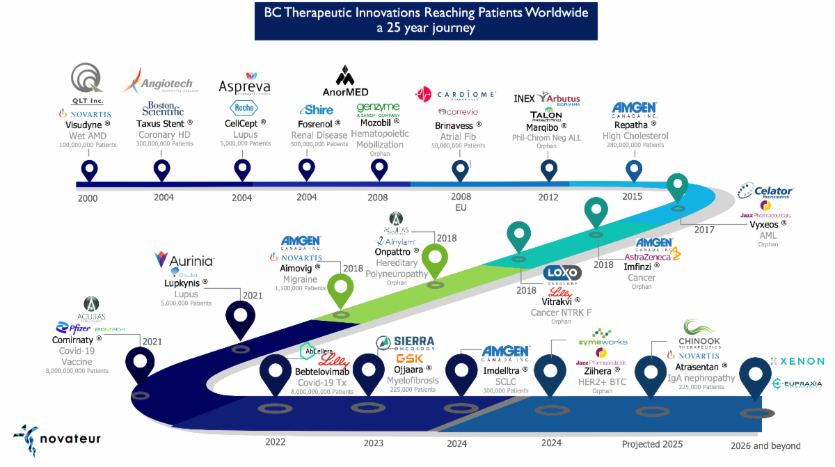 BC has been home to innovations that have impacted the lives of patients worldwide. Notable examples were during COVID-19 when technology and therapies discovered and developed by Acuitas and AbCellera in partnership with major pharmaceutical companies Pfizer and Lilly were at the forefront of the battle against the pandemic. Novateur Ventures has chronicled the past 25 years of therapeutic innovations. | |