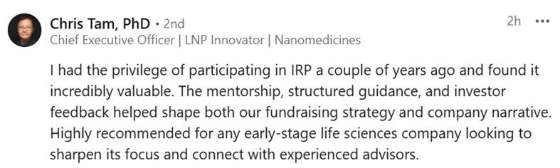 What sets IRP apart is its hands-on, tailored approach. You'll benefit from the expertise and guidance of seasoned life sciences professionals through individualized coaching and mentorship. Join a growing network of successful alumni and take the next step in your growth journey. Learn more and apply today.