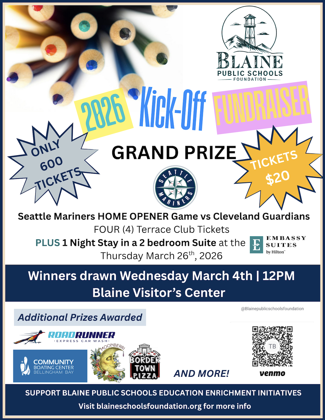 They have a 2026 Kick-Off Fundraiser. There are tickets for $20 that will enter you into a raffle that draws on March 4th for 4 Seahawks tickets, a free night stay at Embassy Suites, and prizes from Roadrunner Express Car Wash, Bordertown Pizza, Community Boating Center, Moonberri, and more!