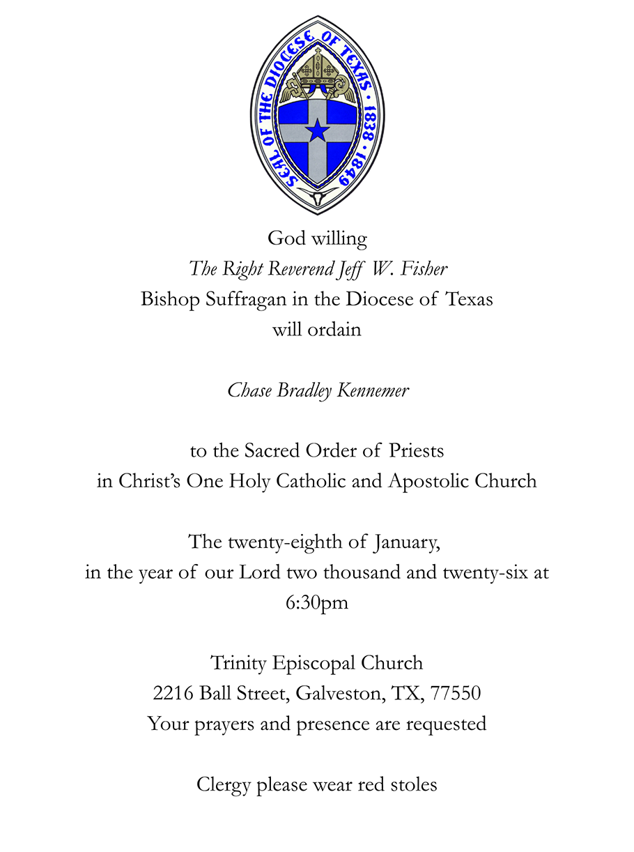 Wednesday, January 28 - Ordination of the Rev. Chase Bradley