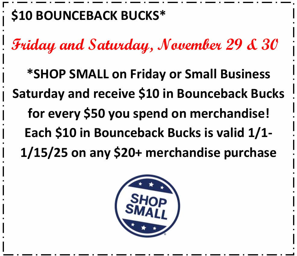 Don't forget you will earn BOUNCEBACK BUCKS for your merchandise purchases Friday and Saturday both in-store and online!