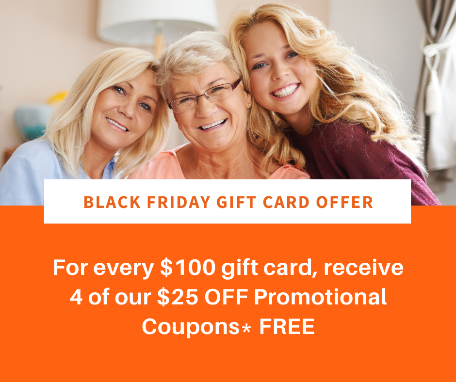 * This Gift Card Promotion is available for purchase online or in-clinic from November 24th to December 2, 2020 at midnight. This offer cannot be combined with any other promotional offers. This offer cannot be purchased with a gift card. Purchases must be made by credit, debit, E-Transfer or cash. This offer cannot be used to purchase gift certificates, pay for memberships or any other promotions. You can only redeem one $25 gift card at a time per visit. Minimum purchase of $100.00+ required. Thank You.
