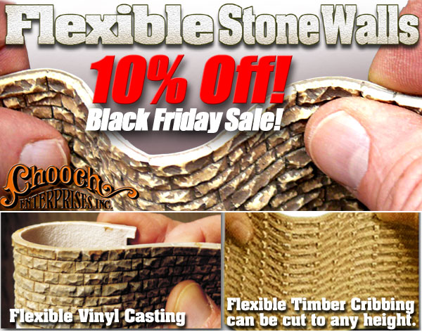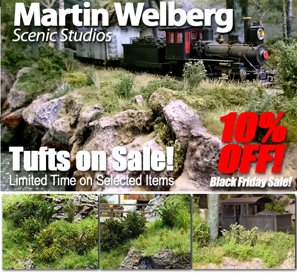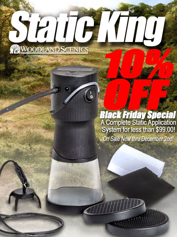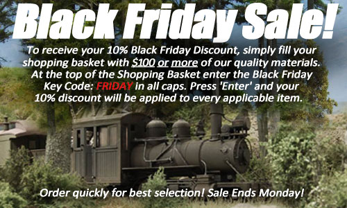 The 10% Off Black Friday NOW in Progress! Sale ends Saturday night at 11:59 P.M. (ET). To qualify for a discount, simply order $100.00 or more of our quality scenery materials. At the checkout Shopping Basket near the top of the page, enter KEY-CODE: FRIDAY in the box and press enter. Your 10% DISCOUNT PRICING WILL APPEAR AUTOMATICALLY ON THE WEBSITE DETAILED DESCRIPTIONS. Phone orders and mail orders must be received within the sale period. *Sale excludes gift certificates, other sale items, prior purchases, custom painting, and shipping. Not redeemable for cash and may not be combined with any other offer or discount. Standard Shipping costs apply. Sale offers are valid online, in-store, by mail order, and at trade shows.