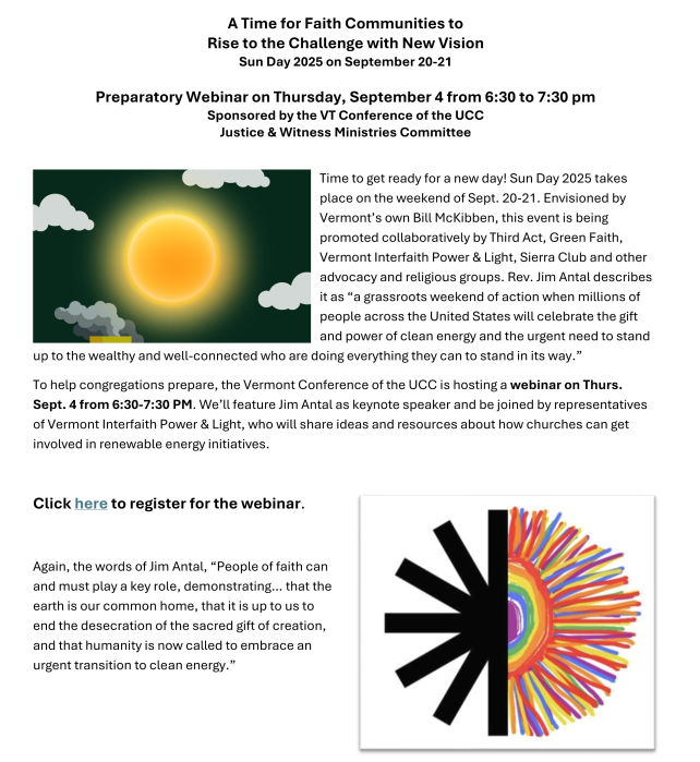 The Justice & Witness Ministries (JWM) Committee encourages all UCC members in Vermont to strengthen our outreach work and to emphasize our faith-based public witness. Upcoming opportunities are the Labor Day rallies on September 1 and the Burlington Pride Parade Festival on September 7. If you attend these rallies, please indicate that you are UCC and that you’re speaking for our church’s faith and values. A suggestion is to attend the rallies with other congregation members and carry signs identifying your congregation and your faith.