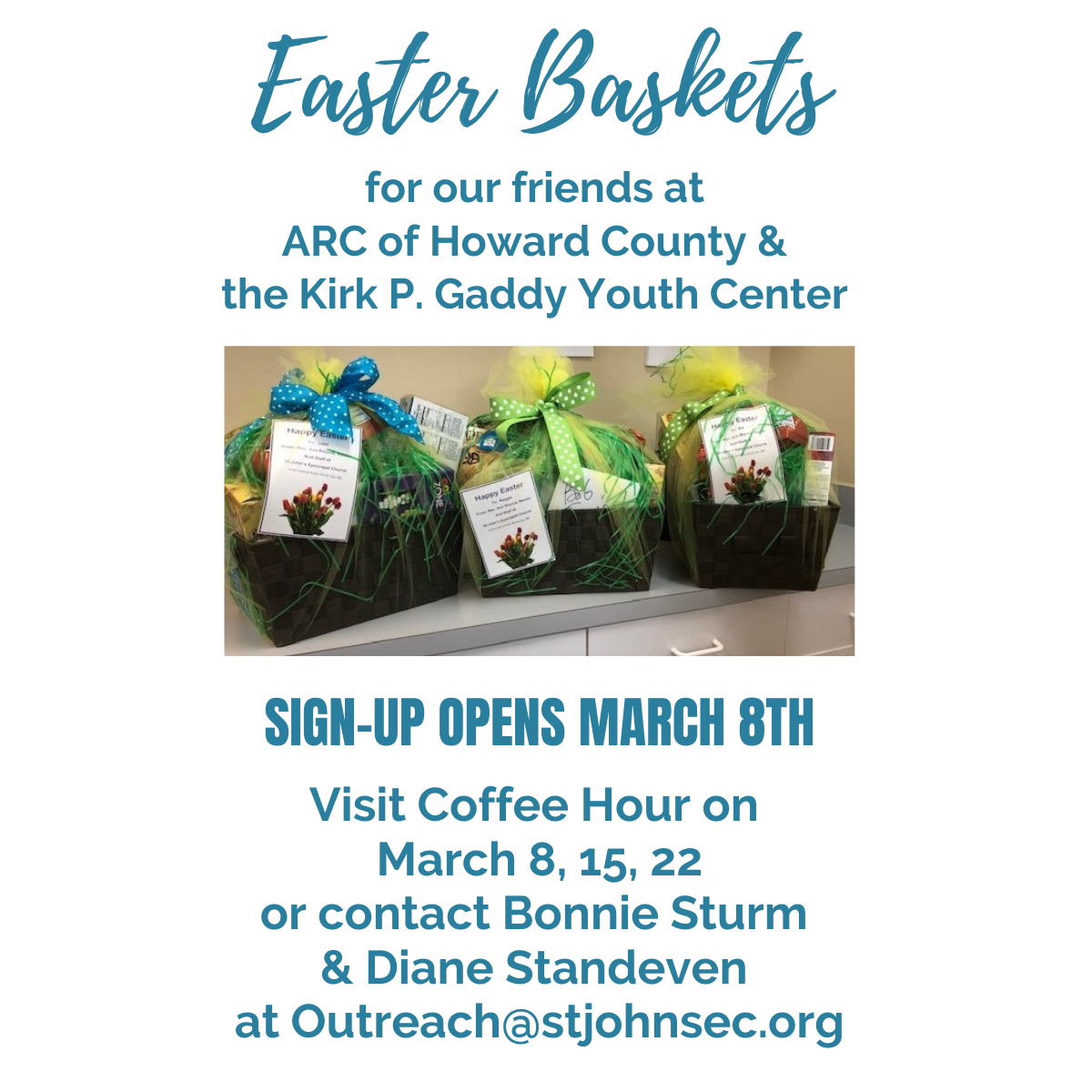 | | Fourth-grade students at the Parish Day School handmade 50 fleece hats for The Kirk P. Gaddy Youth Center in Baltimore. | | St. John's Parish Day School | | St. John’s Parish Day School is proud to present “Boots, Bowties, & Bling,” our 2026 Annual Spring Gala and Auction! Join us on Saturday, April 25th at 6:00 PM for an unforgettable evening of Dinner, Cocktails, Dancing, Raffles, Games, Live & Silent Auctions, Live Music from Jake’s Country Band, and More! Click HERE for more information and to purchase tickets! | | Please keep the following people in your prayers: | | |