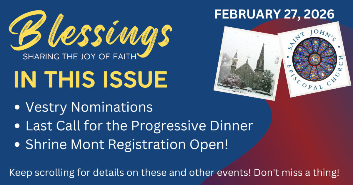 It is time to plan for the election of St. John's new Vestry members (Class of 2029), and we are seeking nominees. If you are interested in being considered as a nominee (or want to nominate someone else, with their permission), please complete the Nomination form linked below. Nomination forms are due no later than Sun., March 22, 2026. If you have questions about the nomination process or what is required of a Vestry member, please email VestryNominations@stjohnsec.org. The Vestry Nominating Committee members are: Gordon Knox, Lucia Martin, Dawn Rea, Marsha Trant, and Ken Wireman.