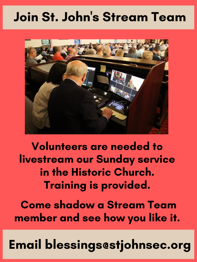 | | Please prayerfully consider joining one of these ministries. They are vital in welcoming people in our community, both in person and for those who need to worship at home. | | Upcoming Events: Mark Your Calendars | | |