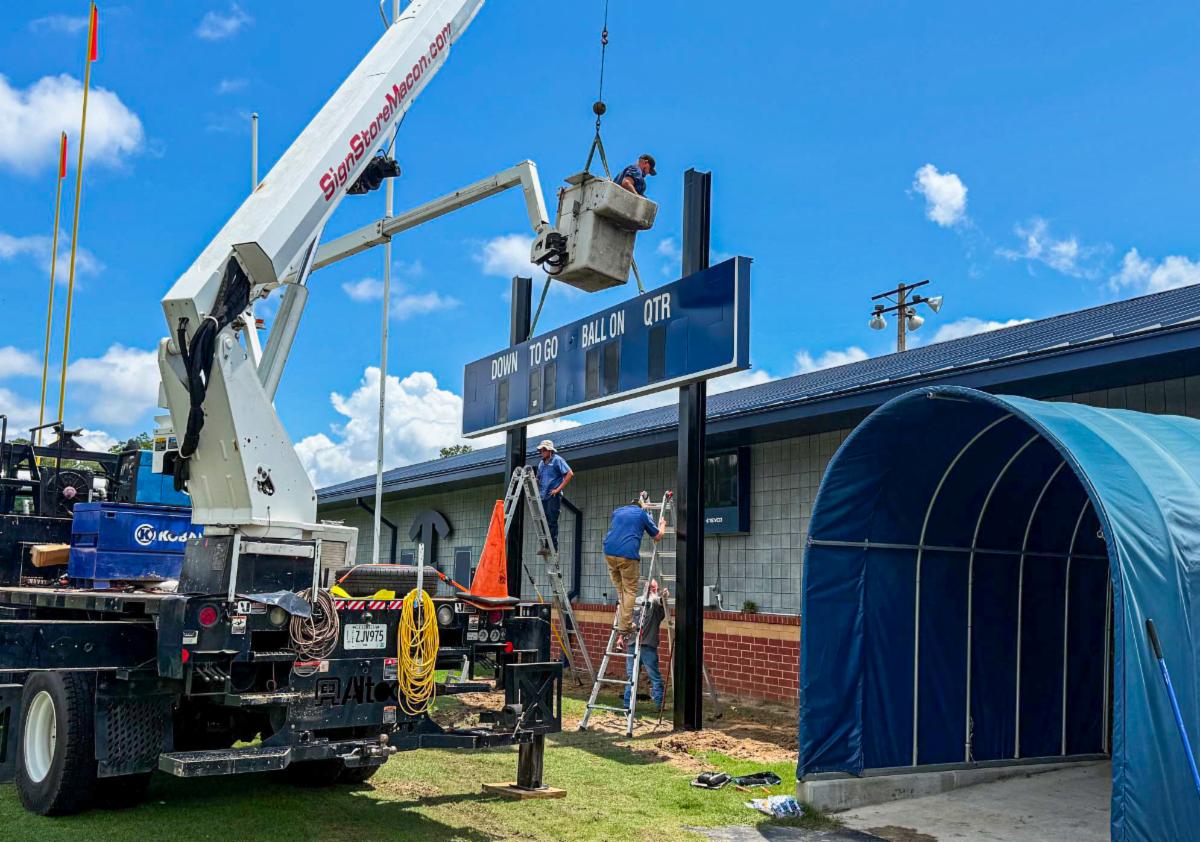 Just in time for the football season, a new scoreboard was installed this week in the south endzone at Brodie Field, replacing the previous board destroyed by a hurricane a few years ago.