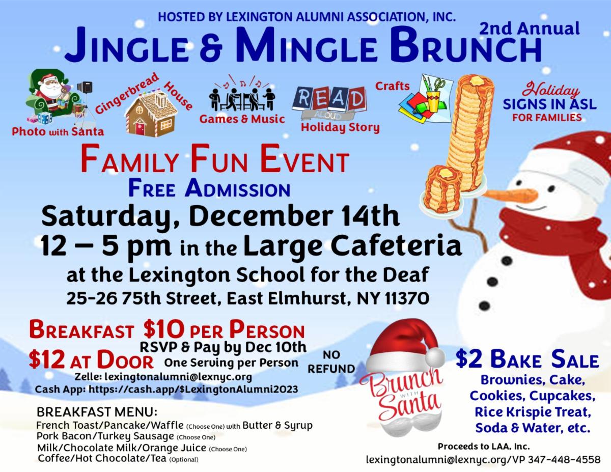 The Lexington Alumni Association (LAA) will host a Jingle & Mingle Brunch on Saturday, December 14th from 12 to 5 pm in the school cafeteria. The family-friendly event will include games, a holiday read-aloud, and a photo with Santa! Contact the LAA at lexingtonalumni@lexnyc.org or VP 347-448-4558 for more information. Advance tickets can be purchased on Zelle:lexingtonalumni@lexnyc.org or CashApp: https://cash.app/$LexingtonAlumni2023