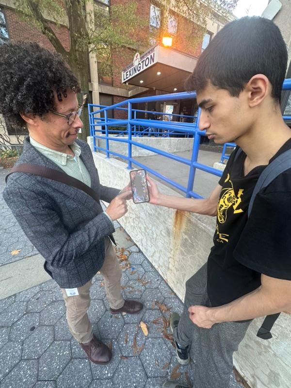 Travel trainer Mauricio Vanegas explains how to use a mobile phone app to plan a route from school to home. | |