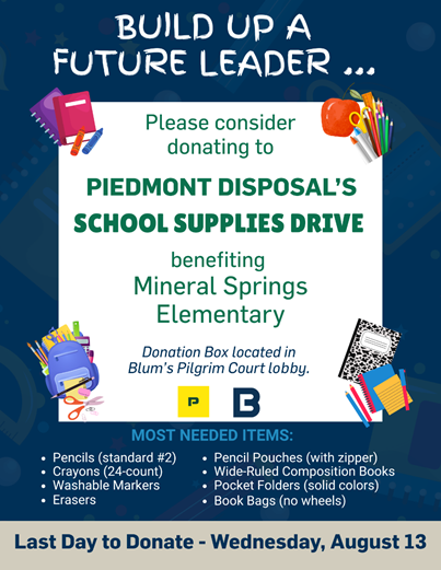 | | Current Volunteer Opportunities | | School Supplies Drive - Partnership w/ Piedmont Dο»Ώisposal | |