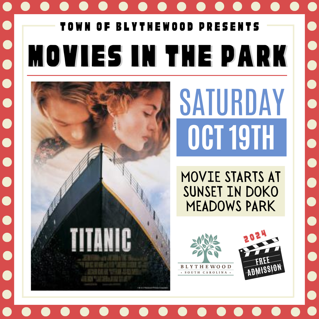 The Town of Blythewood's last movie in the 2024 Movies in the Park series is on Saturday, October 19th! Titanic will be playing and the movie will begin at sunset! Don't miss the last movie of this year's series!
