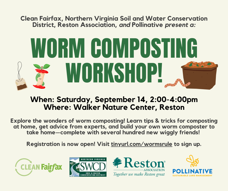 Come build your worm composting bin and learn how to get started at an upcoming workshop at Walker Nature Center in Reston on Saturday, September 14th at 2PM. This workshop is hosted by Clean Fairfax, Northern Virginia Soil and Water Conservation District (NVSWCD), Pollinative Sustainable Land Management, and Reston Association. The cost to participate is $40 per household (to make one bin).