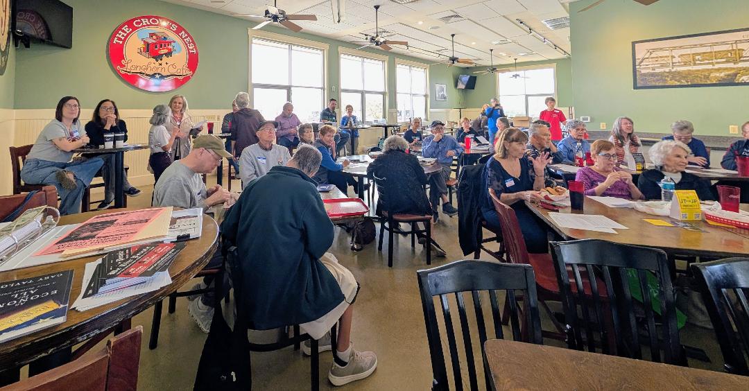 Note: If you plan to eat, please arrive early. You can order food beginning at 11:00 a.m. and eat downstairs or bring your meal upstairs.